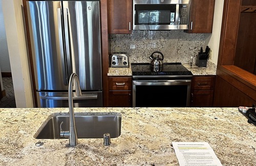 Magnificent mountain views welcome you to the rustic décor of a two-bedroom condominium offering a master suite with a king bed and adjoining bath with a walk-in shower and jetted spa tub, and a guest suite with two double beds and a full bath. Amenities include a full kitchen, dining area, furnished balcony, and living area with sofabed, gas fireplace, TV, stereo, DVD player, and high-speed Internet.