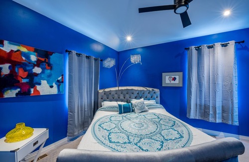Boasting six private ensuites (two upstairs, four downstairs, each uniquely-themed) and a sprawling main floor with designer kitchen, the space is perfect for large groups. The magic doesn't stop there: upstairs, you'll find a 550sqft loft lounge--perfect for breakout gatherings, making a grand entrance to the main floor or just hanging out. The outdoor space is perfect for entertaining, replete with in-line fire pit and custom seating. Downstairs, the vintage Rec room, furnished in classic mid-century modern/atomic furniture, features a full wet bar and provides a great space for gathering as well as access to the four lower suites.