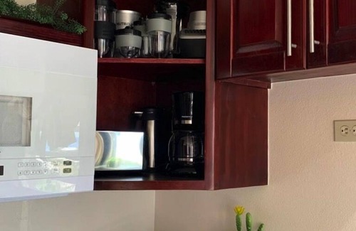 'LenDeen's At Morris Hill' is a charming one bedroom suite located on Morris Hill, with fabulous views of Morris Bay and Cades Bay Reef. For your astute and budget conscious traveller, this accommodation boasts a fully air conditioned, clean, one bedroom, one bathroom, internet/cable access, private entrance, on site parking with easy access to local bus service. Spectacular view of Cades Reef with Morris Bay beach within walking distance. Fully furnished kitchen for cooking, equipped with a fridge, stove, microwave, toaster oven, toaster, hot water kettle, and coffee machine, NutriBullet smoothie maker, blender, pots, pans, an assortment of glass and plastic wear for eating, drinking, cooking and storage.