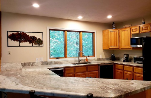 The kitchen features hardwood floors, granite countertops, and a pull up bar. Fully equipped it includes: electric range, microwave, dishwasher, fridge, trash compactor, Mr. Coffee maker, blender, electric griddle, waffle maker, and all the pots, pans, and casserole dishes you need.