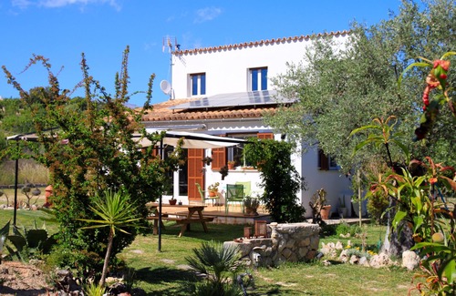 The cosy Finca Son Font (Vistaselva) is located about 15 minutes' walk from Selva in the middle of a picturesque agricultural setting. From the spacious terrace you can enjoy a marvellous view of the village, the countryside and the surrounding mountains. The house is spread over two levels with a quiet bedroom on the ground floor, a cosy living and dining area, a fully equipped kitchen and a spacious bathroom with a large shower. On the upper floor there is a further bedroom with its own bathroom. The use of air conditioning (hot/cold) is at an extra charge and can be booked as an option depending on the season. In winter, a pellet stove provides cosiness. The Mediterranean garden with overflow pool surrounded by olive, citrus and fruit trees as well as a pond and flower beds offers a peaceful oasis of relaxation. The terrace with its shady pavilion invites you to linger in the greenery.