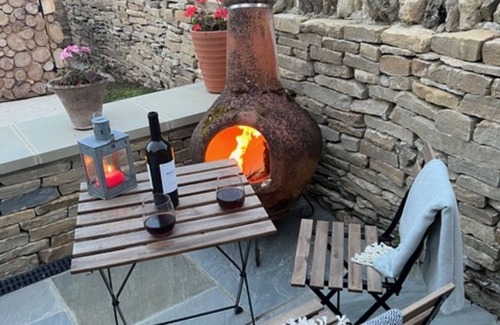 At ground level, double patio doors open onto a private terrace surrounded by terracotta pots and a drystone wall. There is a garden table and chairs, reclining deck chairs, a chiminea (logs provided) and a small barbeque. This looks out over a lawn and pond and surrounding countryside. There is a bench next to the pond where you can sit and relax, soaking up the evening sun.