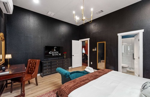 - Primary Bedroom (Edgar Allan Poe Theme) King Bed, Smart TV, Desk, Walk-In Closet, and Ensuite Bathroom