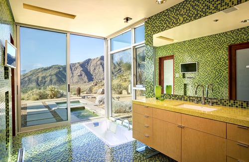 Located on a secluded, prestigious street above downtown Palm Springs, Il Cielo has neighbors, but you won't see them (and they won't see you). Pull into your private parking area and choose from 5 bedrooms, each with its own en-suite bath and private entry. Sneak out for a late-night swim; each bedroom has an access path to the 40" pool and jacuzzi.