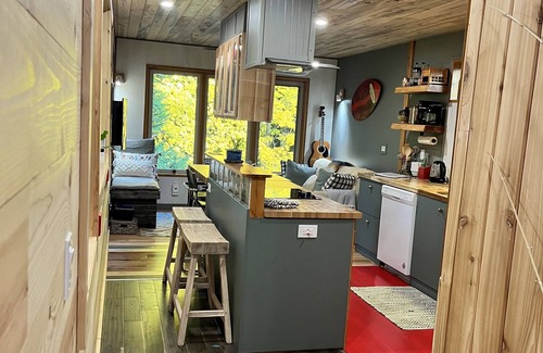 Newly constructed cozy creative loft in serene peaceful setting near Rock Creek, with separate bedroom with sink, full bathroom, full kitchen, and den with couch and lounge beside window for forest viewing, gas fireplace, deck overlooking forest. Chickens are on site providing farm fresh eggs as available. We strive to be friendly to the environment, using many materials in the construction that are considered LEED certification worthy. The thoughtfully rustic charm will keep you coming back.