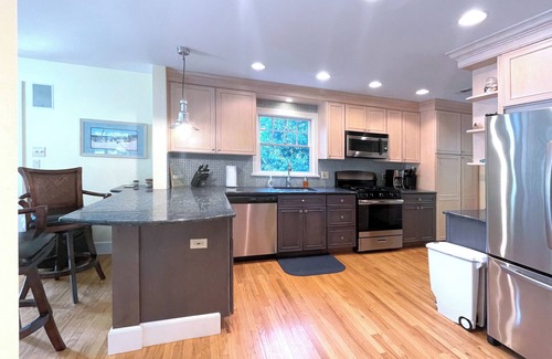 Spring Lake, NJ - Summer at the Jersey Shore in this private, quiet, newly renovated home! This home features an open and airy floor plan, great room and open kitchen with granite and stainless steel appliances, new baths, hardwood floors, front porch, and private yard with gazebo. Central A/C. This is one of the most private lots at the end of a cul-de-sac which offers great safety for children. One queen bedroom on first floor with attached bath and three large bedrooms on second floor, offering privacy for guests (one bedroom includes 2 sets of bunk beds - perfect for kids). Conveniently located a few blocks to the beach and just a short walk to town and Divine park. One block from Marucci park with playground, soccer fields and tennis courts. Sleeps 10-12.