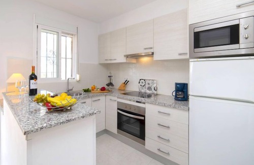 Imperial Park: Modern terraced house "Imperial Park". 3.3 km from the centre of Calpe, in a busy, sunny, elevated position, 2.5 km from the sea, 2.5 km from the beach. For shared use: large, well-kept terraced garden (fenced), natural garden, 3 swimming pools (seasonal availability: 01.Jan. - 31.Dec. pool opening hours: 10:00-20:00) with internal staircase. Unconventional pool shape. Children's pool, outdoor shower, patio, pergola, garden furniture. In the house: reception, lift. Shop 2 km, supermarket 2 km, restaurant 50 m, bar 200 m, café 50 m, bus stop 1.3 km, sandy beach "Playa De La Fosa" 3 km, diving center 1.5 km. Sports harbour 2.5 km, marina 2.5 km, golf course (18 hole) 10 km, surf school 2.5 km, sailing school 2.5 km, tennis 2.8 km, minigolf 3 km. Nearby attractions: Aqualandia, Mundomar, Terra Mítica, Terra Natura, y Benidorm Palace (Benidorm). Please note: car recommended. Reception open 10:00-15:00 hrs. Suitable for families. Please note: guarded residence. Additional accommodations can be booked. All houses/apartments are individually designed/furnished. Neighbourhood highly sensitive to noise. Quietness and good behaviour expected.