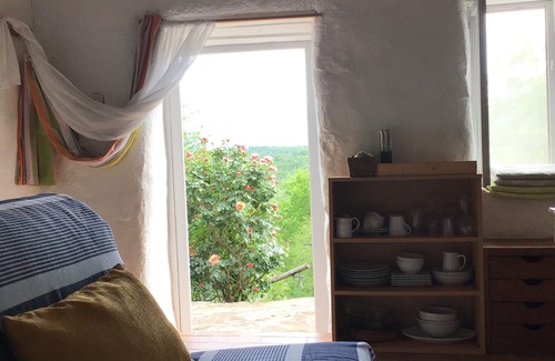 Our accommodation is situated directly underneath the main Catalan farmhouse where we ourselves live on a south facing terrace, giving stunning vistas across the mountains to Spain on left and the village of Montferrer perched above, right. The studio is a small but delightful self contained flatlet, comprising an attractive and comfortable sitting/dining room with doors opening onto terrace, an adjoining fully equipped kitchenette and bathroom with shower. Stairs from sitting room lead to cosy mezzanine with double bed. Outside there's a private terrace with steps leading to private garden area. BBQ and garden furniture provided. Plenty storage utility room.