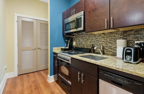 The unit features a cozy living room with a comfortable sofa, a flat-screen TV, and plenty of natural light. The bedroom boasts a plush full-size bed, a dresser, and a closet for ample storage. The bathroom is clean and modern with a shower/tub combo. The fully-equipped kitchen includes a refrigerator, stove, microwave, marble countertops, and coffee maker, along with all necessary cookware and utensils. Not to mention in-unit laundry!