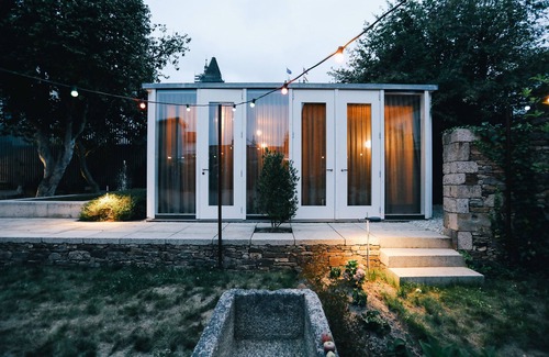 On the other side of the spacious garden, you will find a private apartment-suite for 4 people with an exclusive patio and an outdoor table to enjoy outdoor meals. This contemporary module of Galician pine and glass was built externally and deposited with a crane from the Obradoiro to our garden. Hidden, you can take an outdoor bath in the custom-made bathtub with native granite for a refreshing dive after a hard day of leisure.