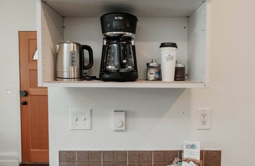 Enjoy eating in and preparing meals in the kitchen. Kitchen is efficient and includes all of the basics for preparing meals including cookware, dishes, utensils, coffee pot & microwave. There is a small table with seating for up to 4 that can also double as a workspace.