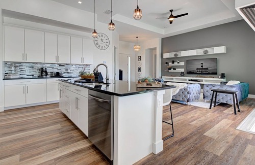 The Master suite with King bed, contemporary nightstands, dresser, 65" smart TV, sliders to pool deck, walk-in-closet, retro towel rack and dramatic bath with his and hers separate granite vanities a freestanding soaking tub and a walk-around-shower are yours as well. There is a Junior Suite with another King bed, dresser, 50" smart TV, large walk-in-closet and on-suite bath with shower. Bedroom 3 and 4 both come with King beds, nightstands and a 50" smart TV. They share a bathroom with single vanity and walk-in shower. This bathroom also serves as pool bath. There is a laundry room complete with tub and front-loading washer/dryer and a two car garage with opener.