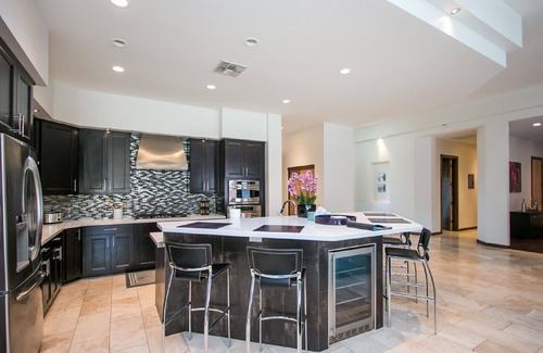 Facilitated with a well lit, contemporary pool and built-in TILE JACUZZI, this house is ideal for groups of travelers who want an extravagant vacation in Scottsdale. The sparkling pool is surrounded by well maintained palm trees and grass, all enclosed within an enchanting backyard.