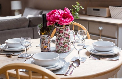 The accommodation is arranged over two floors. On the ground floor are two bedrooms, one ensuite super-king double and one twin (both rooms can be either super-king or twin on request) and a family bathroom. Head up a wide, carpeted staircase to the light and contemporary, open-plan living-dining area and fully equipped kitchenette. The living area has a comfortable, 4-seater corner sofa, which can be converted into a double sofa bed on request. Guests will find a log burning stove for winter evenings and a Smart TV, DVD player and sound system to relax to after a day out exploring the Cotswolds.