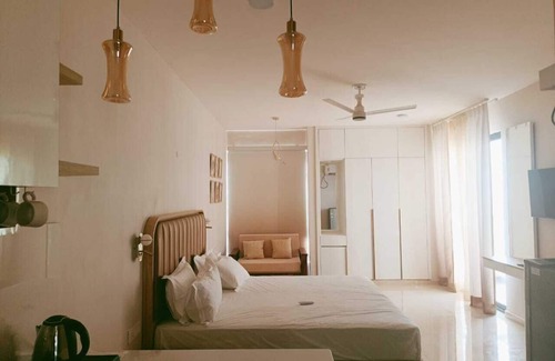 A thoughtfully designed, fully furnished studio apartment in the heart of Vrindavan—offering a rare blend of comfort, convenience, and spiritual calm. Whether you're a solo traveler seeking peace, a couple exploring Vrindavan's spiritual charm, or a small family on a devotional journey, here you wake up to the stunning view of Chandroday temple right from comfort of your bed.