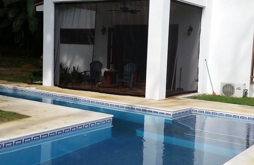 It's a 12 minute drive to the beach. The house sits on 8 acres of forest, with a swimming pool . There are 2 guest rooms with their own baths, a master suite, with both an indoor and outdoor bathroom and a half bath off the first floor. The property also includes a guest house, with a queen bed, kitchenette and private bathroom. The guesthouse is not air conditioned, just a ceiling fan. The house also has a washer/dryer, smart T.V ,with streaming from U.S. stations, a Bluetooth sound system, 5G fiber optic Wi-Fi and an outdoor grill. The property is landscaped with fruit trees and many different types of flowers. The house was designed to have the natural breezes travel thru the living areas. The bedrooms have a/c, DO NOT try to cool the entire house with the bedroom units. Thank you for your cooperation.