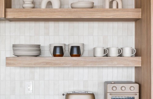 The property was designed to entertain with resort-style amenities and features. A 40-foot sliding glass door opens up completely to the outdoor area, where you'll enjoy a pickleball court, hot tub, built-in firepit, outdoor shower, and native landscaping including a Joshua Tree. The infinity pool is a focal point of the property, outfitted with in-pool chaise loungers and moody lighting that transforms the space at night. When you aren't lounging at the property, you'll have the wonders of Joshua Tree National Park minutes away, along with all of the area's bars, boutiques, and restaurants nearby.