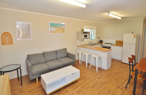 This older style 2 bedroom Unit has had some renovation work on it which makes it nice & cosy and comfortable. (1 x Queen & 2 x Singles). A reverse cycle box air con in living areawithceiling fans to both bedrooms. The TV is in the combined lounge /dining area. The small kitchen covers all your cooking needs with a microwave, electric oven/stove, fridge/freezer and basic kitchen waresfor your holiday. There is a auto washing machine in laundry that also leads to the smaller bathroom/shower with a separate toilet .