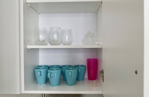 La residencia tiene una cocina completamente equipada con electrodomésticos modernos, incluyendo nevera, estufa, horno, microondas, cafetera, tostadora y utensilios de cocina. También hay una barra de desayuno con taburetes donde se pueden disfrutar de comidas informales.