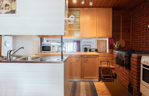 Wooden cottage 1988, renovated in 2008-2010, kitchen, living room, 3 bedrooms (1. bedroom with a double bed, 2. bedroom with bunk bed and 3.bed room (only a folding door) with double bed). Sauna, shower room, wc, walk in closet, terrace (30 m²). Kitchen and living room are on two different levels. The living room and one bedroom are lower than normal, their room height is about 190 cm. There are removable gates at the top of the stairs to the terrace.