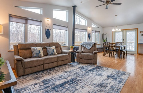 As you follow the illuminated pathway to the guest entrance, you'll be greeted by French doors with a keyless entry system that leads to the open-concept great room of the Hickory Tree House. The room boasts cathedral ceilings, an abundance of windows that offer scenic views and natural light, and plush seating for ultimate relaxation. Get cozy by the gas fireplace or enjoy your favorite shows on the 55" streaming TV using your own login credentials. You can also watch a movie from the DVD collection or read a book from the library located on the kitchen island.