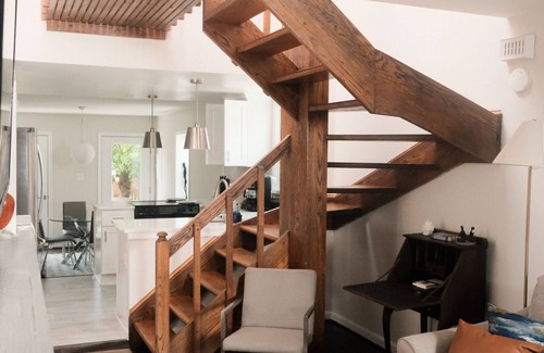 Step into this remarkable townhome and be captivated by the historic oak stairway leading to the second floor, where a skylight window fills the staircase with natural light, creating an enchanting ambiance. Paired with the floor-to-ceiling bookcase, this exquisite combination of architectural charm and luminous atmosphere sets the stage for an unforgettable stay.