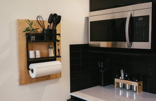 Opting for a clean and uncluttered energy, you’ll find this property equipped for the most discerning guests. A fully stocked kitchenette awaits you equipped with a microwave, small fridge, toaster oven, portable double burner, plus all of the essentials to accommodate your needs during your stay. A drop table and chairs are tucked in to the space for your convenience. The living spaces display the contemporary decor with a hint of mid-century style. Colors are serene and neutral and comfort is the standard. Wall-to-wall windows flood the space with natural light and offer beautiful views.
