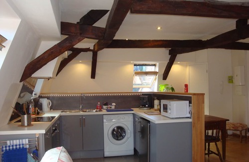 Charming medieval colombage property situated along a cobblestone lane in the square of Beaulieu's 12th century church. Centrally located, in walking distance to all amenities and just a few minutes walk to the Dordogne river. La Charente is full of charm showing off the magnificent beams of the roof structure and medieval carved beams in the bedroom is located on the 3rd floor accessed by stairs. Double glazing and electric heating provides a warm and cosy apartment for rent all the year. Large windows fill the apartment with light and offer beautiful views of the church, rooftops of Beaulieu and hillside. The living room and kitchen are open plan. The living area with double sofa and arm chair provide ample seating and he kitchen is fully equipped and modern. A small hallway separates and gives access to the large bedroom and separate full bathroom. The single bedroom sleeps 2 comfortably. The bed is 180 x 200 (two 90 x 200 mattresses in the frame). 2 bedside tables, dresser, closet and built in shelving completes the bedroom. The bathroom is spacious with full size bathtub including shower, under floor heating, cabinets, towels and hairdryer. Access to the apartment is by a common entry door at ground level and each apartment has an interphone for entry door access. The apartment is fully equipped with all the necessities required for cooking as well as all linens and towels. Wi-Fi Internet free. See other units we have available: HomeAway #3888479 or HomeAway #3997515.