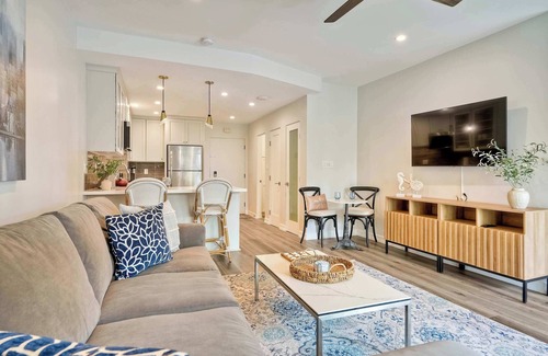 Inside, La Costa Comfort combines modern style with coastal charm. The living area features a plush sofa and a smart TV, perfect for unwinding after a day in the sun. The sleek yet warm kitchen is outfitted with stainless steel appliances, stone countertops, and crisp white cabinetry—complete with a Keurig for your morning coffee. Enjoy meals at the cozy dining nook for two or snack at the kitchen counter. The bedroom provides a quiet, restful space with a built-in desk for any remote work needs. After a day of fun, step out onto your private balcony to savor a drink and the ocean breeze.