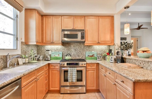 •Chef's kitchen with granite counters, pantry storage, and up to date appliances including: toaster, blender, coffee maker, tea kettle, large crockpot, microwave, stove, oven, refrigerator with water dispenser, freezer, dishwasher, garbage disposal, dishes, utensils, and glassware for up to 12, full set of pots and pans, cookware, etc.