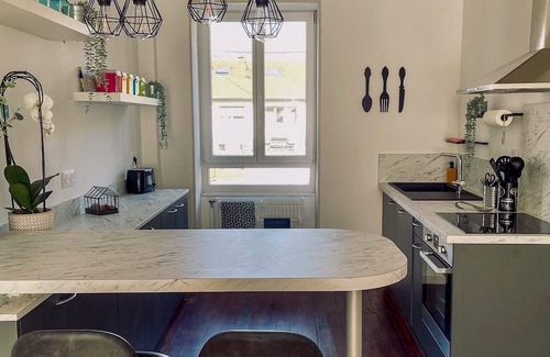 The flat, bathed in light and decorated in soothing green tones, offers a relaxing atmosphere. A full kitchen and parking facilities complete the experience, ensuring the perfect retreat after your Alsatian exploits.