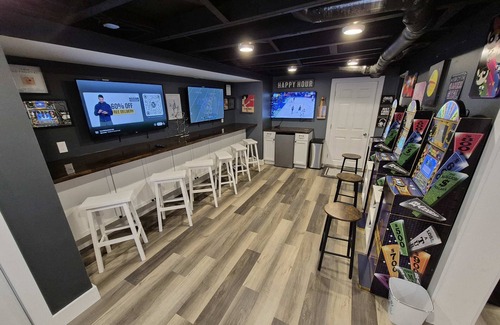 Step inside this spacious 2200 sq. ft. home and discover a haven of comfort and entertainment. This property boasts four well-appointed bedrooms, each featuring its own TV for personalized viewing. With a total of six beds, there's ample space for everyone. The home includes three bathrooms: two full bathrooms and a convenient WC. The highlight is the 500 sq. ft. bar-style arcade, equipped with three 50-inch TVs, perfect for streaming your favorite content and catching multiple games simultaneously. Enjoy the convenience of two full-sized washers and dryers to make laundry a breeze. Outside, the property offers 80 feet of water frontage and a private 40-foot dock, leading to a sandy-bottomed area ideal for swimming and wading. The double lot provides plenty of space for outdoor games and relaxation. Parking is available with three spots directly in front of the house and an additional three spots in front of the black chain-link fence. Situated on a cul-de-sac, the home is easy to locate and offers a peaceful retreat.