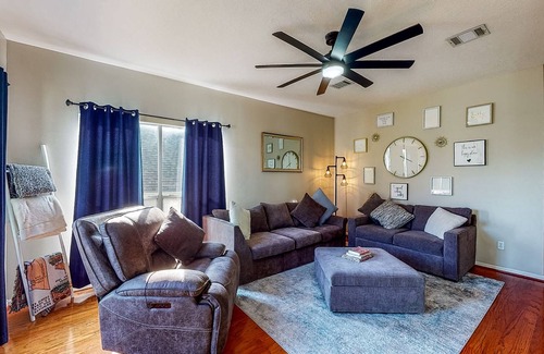 Inside, a welcoming open floor plan provides plenty of space to spend time together. Unwind into vacation mode and watch a movie in the living area, and prepare favorite recipes in the fully equipped kitchen. Large windows in the dining area create a sunny spot to enjoy home-cooked meals together.