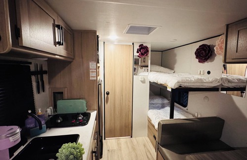 Nestled in Marblehead, our cozy camper makes the perfect Lake Erie retreat. Inside, you’ll find an inviting open-concept living space with a queen bed and two bunk beds, ideal for couples or small families. The camper is fully equipped with air conditioning, heating, and a kitchen to keep you comfortable after a day of exploring.