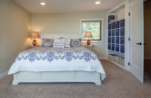 The property boasts over 500ft of lakeshore, with two separate beaches and gorgeous westerly sunset views. There are kayaks, paddle boards, beach toys, and a canoe to enjoy the lake from shore of the sugar sand beach. Relax and enjoy the views on beach chairs during the day or by the fire pit at night.