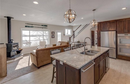 15 lakes - like-new lake home! Three bedrooms with at total of 7 beds will sleep 12 comfortably and 2 full bathrooms. Dock, lift, and fully furnished. Granite countertops, stainless appliances, heated ceramic tiled floors, pot filler over range, nine foot ceilings, two bedrooms on the main floor with a 10 x 32 lakeside deck. The living room features large windows with stunning lake views.Sauna and Boat House included.