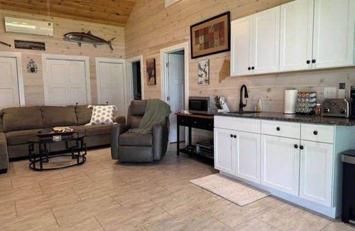 Make memories of a lifetime at this unique and cozy family-pet-friendly private lakefront on Messalonskee. Beautifully manicured lawn/gardens with a fire pit surrounded by the peaceful sounds of nature. A large dock to take in the spectacular views of bald eagles, loons, and blue herons. Owners boat is attached for occasional boat rides. This guesthouse is newly built with a covered porch overlooking the serene lake. Comes w/3 kayaks, 2 paddle boards, a paddle boat, life jackets, and a canoe. As well as lawn Yahtzee, glow in the dark jarts, large jenga, Corn Hole game, boxing gloves, and punching bag. For the rainy day, relax nestled with a book, board game, puzzle, or play Xbox console. Make some popcorn with an old fashion kart and enjoy a movie.