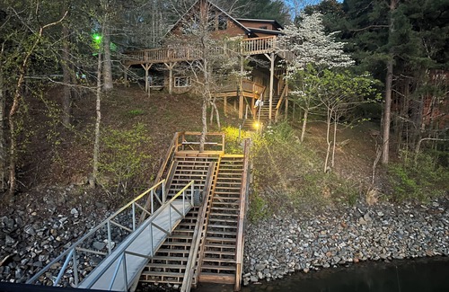 Our lake getaway is the perfect place for lake fun including fishing, swimming, hiking, kayaking and boating, Magnificent lake views can be seen from inside and outside the house. Large windows, French doors, lakeside hot tub, and screened porch have lake and mountain views. Loungers, dining tables, fire table, rocking chairs, and swinging chairs just outside the doors on the large decks. Hot tub lake views just outside the lower deck doors. Only 25 feet separate guests from the lower deck steps to the shoreline. It may be difficult to access the lake for those with mobility issues because steps are along the path and down a hill to the dock ramp.