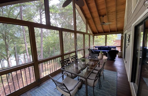 But that's not what you came for, is it? Outside the sliders, you'll find a huge, screened-in porch with great views down to the LAKE. Two ceiling fans keep you cool when it's hot and there is plenty of seating for whatever you want to do, whether it be relaxing, eating, drinking, or even playing games. A three-burner Weber grill is just outside the porch to handle those tasty grill nights!