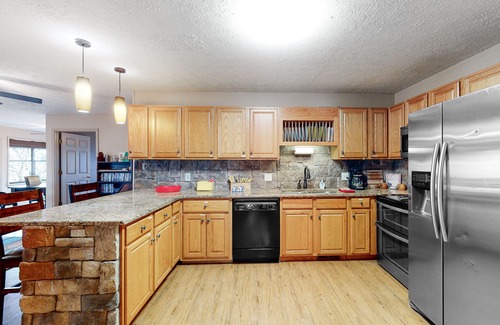 Enter the house via the white screen door into the large kitchen with granite counters, stainless steel appliances a breakfast bar, and a rustic stone backsplash. The open floor plan allows for cooking while enjoying conversation with friends or family at the breakfast bar or the dining area. There is a large rustic wood dining table in front of the stone fireplace. On each side of this area are two living spaces. On the left is a sectional sofa and a smart TV and on the right is a convertible sofa sleeper and a smaller table for board games or additional dining.