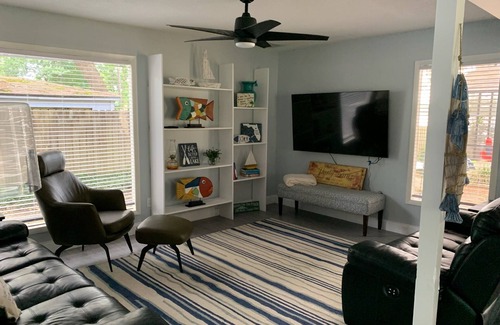 Upstairs, guests will find a completely remodeled kitchen with all stainless steel appliances, 2 bedrooms (one with king bed and one with twin bed and trundle bed), full bathroom, dining table, laundry room, living room with smart TV and cable, covered porch with fans on which to enjoy your morning coffee or watch the sunset in the evenings.
