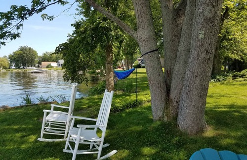 Imagine yourself relaxing on a lawn chair sipping iced tea with a warm breeze, a good read and listening to the lapping of gentle waves while gazing at miles and miles of nothing but blue water. Maybe you would rather take one of our many kayaks across to the Frenchman's Island and explore or swim and play corn hole toss, and have a cookout in the lawn . How about sitting by a campfire watching an incredible sunset telling new and old stories. Maybe nature is something you would rather see from inside. The view from the living/dining/kitchen of the Haven is something that just captivates, intrigues, and never gets old. Beautifully landscaped, and comfortably decorated lakefront property with a private dock ,a large yard and patio with comfortable outside seating, a gas fire pit for nights you don’t want to hang out by the wood fire. Remember to bring wood for The lakeside wood fire pit and enjoy sitting in the lakeside comfortable adirondack chairs .