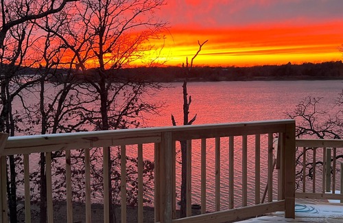 This beautiful lakeside home sets directly on the lake. If you are inside you will likely find yourself gazing out the 2 story wall of windows that face the lake. The beautiful sunsets over the water alone are worth the stay. They are breathtaking.