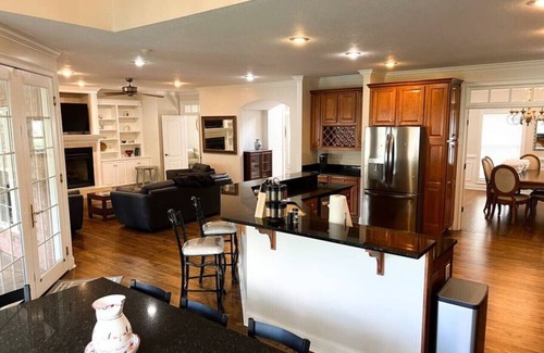 -The expansive kitchen is fully equipped and features an additional refrigerator in the garage, perfect for larger gatherings.