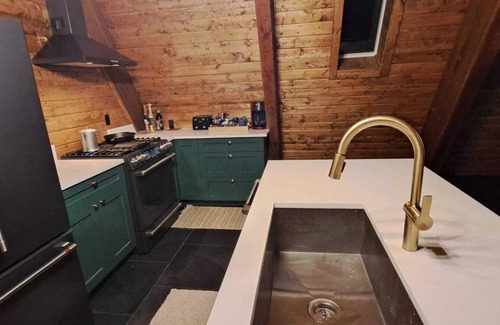 Step inside, and you'll discover a cozy yet spacious interior, thoughtfully designed to maximize both functionality and aesthetics. The open-concept living area features exposed wooden beams that soar to the peak of the A-Frame, creating a sense of grandeur. A large pellet stove takes center stage, inviting you to unwind in front of a crackling fire after a day of exploring the great outdoors.