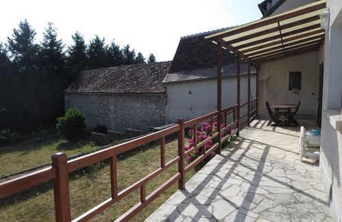 From the living / dining room you have got a view on the garden down to the river 'La Creuse'. You access the garden from the terrace which stretches over the complete width of the house with one half covered. A few steps down a grassy area with flower beds (former chicken yard) and further down a large garden, adjacent to a park belonging to one of the two castles of the village Lurais.