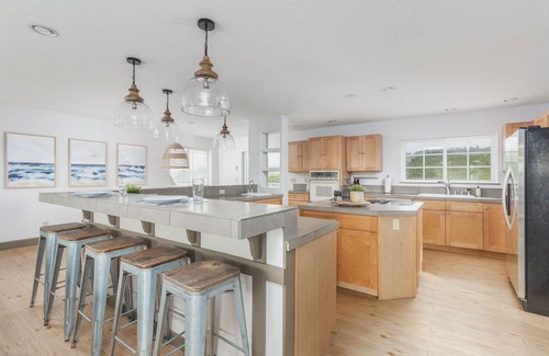 Second Floor: There are four bedrooms on this level. The Bunkroom features three twin-size bunk beds (six twin beds total). Bedroom 2 features two single twin beds. Bedroom 3 has a king bed with a soft pillow top mattress. Bedroom 4 is an ensuite with a walk-in shower, a king bed, and a twin-day bed with a trundle. A guest bathroom with a bathtub is off the hall on this floor. Sunset Shores has room for everyone!