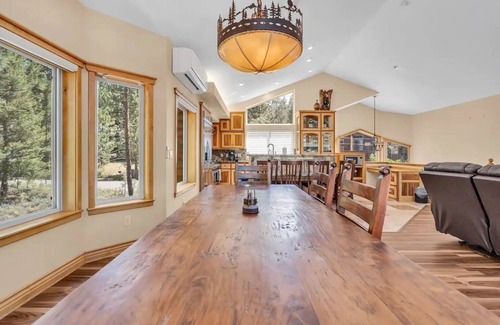 A large dining area offers plenty of seating for all. with is an abundance of natural sunlight, and floor to ceiling windows that highlight the incredible views of Mount Tallac.