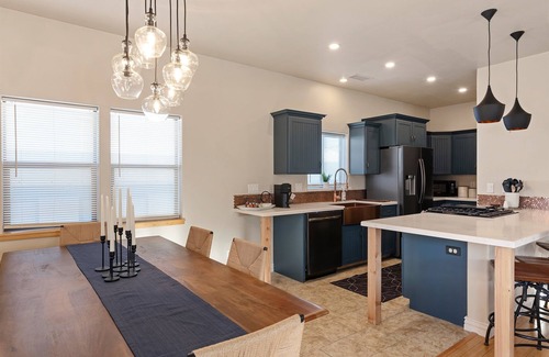 People with mobility issues will find the first and main level very easy to maneuver. The kitchen is decked out with brand new white quartz countertops, navy blue custom cabinets, state-of-the-art copper-colored stainless-steel appliances including a third-row dishwasher, gas stove/oven with air fryer feature, upgraded lighting and great kitchen gadgets making family meal prep and entertaining enjoyable. There are features like old lanterns and copper penny backsplash giving a gentle nod to the old copper mining days that Jerome was built on in the late 1800's.