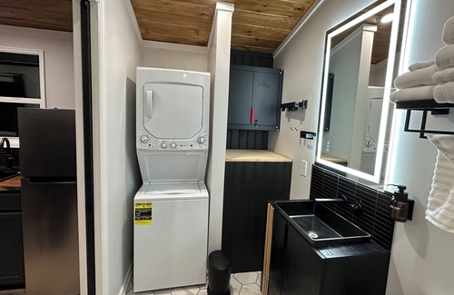 Welcome to Layla Haus – a modern studio tiny home with stylish décor. Enjoy coffee on the spacious porch overlooking a field where horses often graze. Out back, a private fenced yard offers a peaceful retreat for you and your small dog.